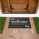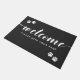 ペットの飼い主の家族、犬、猫用の黒いウェルカムマット。黒に白い詳細。書道のクラシックはっきりしたへようこそ。足を拭いて下さい。四隅の小さな足跡が四つある