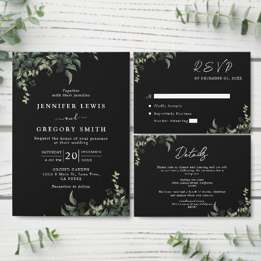 白黒グリーンリー植物水彩結婚式招待状