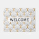 白、金ゴールド、黒のアートデコファンの花のモチーフ歓迎ドアマット。このデザインは1920年代のギャツビースタイルの花の模様を特徴としている。