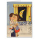 皿をしている間接吻している夫および妻を示すかわいいレトロのアートワーク。 窓で見られるの微笑の三日月形の月。
