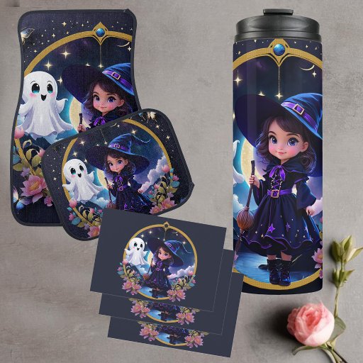 目の大きな小さなきらめく魔女。彼女の隣に浮かぶ可愛い幽霊フレンドリーはオーラを持ってよくはしゃぐいる。デザインは友情感じと魔法の念を伝える