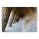 通路は公園Guell、バルセロナ、スペインの石で覆われた柱そして壁によって縁どりました。