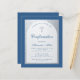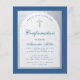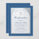 予算の少年の確認招待。クラシックブルーの長方形の背景には、白い背景にフェイク内側のブルー文字を持つ銀箔のアーチがある。「確認」と名称は書書書にあエレガントり、1行目はアーチ型の文字。