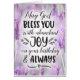 この書道と手レタリングのスタイルカードを持つハッピーバースデーに願うユニーク。「誕生日に喜びを豊かに祝福してほしい。 色あせた紫色の花の背景を持つハート、花、およびタイプのアクセントを含む。内部には、このメッセージが含まれていカスタマイズるが、独自のニーズに合わせることができる:ハッピーバースデー!神の年の中で最も豊かな恵みを祈来る。