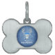 3つの青いバラを身に着けた大きな〔雄ジカの〕枝角を持つ白い神秘的な鹿の頭を持つミステリアスなブルーの骨型ペット識別ラベル。名カスタマイズ前とテンプレート付きの電話番号
