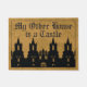 私の他の家はグランジな大理石の金ゴールドの背景の黒のゴシック様式中世フォントおよび城のシルエットが付いている城の玄関マットです。