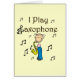 音符およびサクソフォーンを演奏している棒の姿の女の子私はサクソフォーンのTシャツ、磁石、トートバック、カード、ステッカー、キーホルダー、mousepads、枕および他のサクソフォーンプレーヤーの服装およびギフト遊びます。