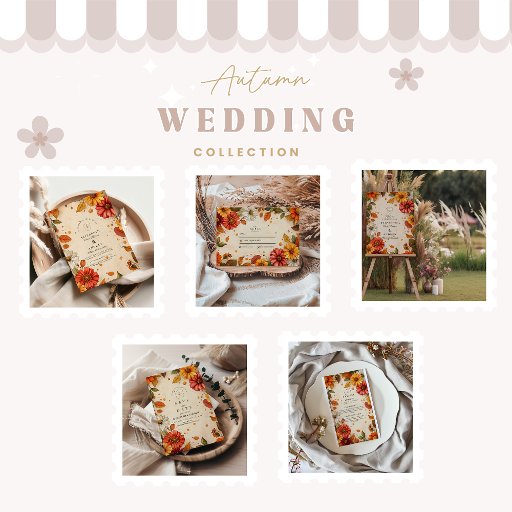 この明るい秋のデザインで特別な日に喜びと温結婚かみを持ち込む。赤、黄色、白鮮やか色のデイジーに散在する紅葉を搭載し、素朴でロマンチックなお祝いに最適。ユーザーの詳細で完全に編集可能