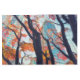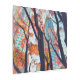 紅葉の紅葉が美しい街の建物。オレンジ離れ色、赤色、黄色の色合いがある。建物は空モダンを反射するガラスの面がある。空は薄青だ。木の幹は暗く、明るい背景にシルエットになっている。