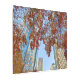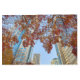 紅葉に囲まれた街並みの低角度な景色を写し鮮やか取る。赤と黄色のラデンを持つ木の枝離れが、青い空に対して自然なアーチ澄んを作る。背の高いモダン建物が背景に立ち上がり、太陽の光を反射してガラスが見える。