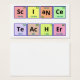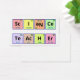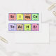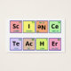 名刺.「科学先生」という言葉は、元素の周期表の記号を使って書かれている。ネオン(ネ)という元素は、「科学」という言葉に必要な文字を得るために逆さまに折り返された。