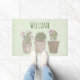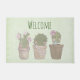 ようこそドアマットとお洒落デザイン。3かわいいサボテンが列に並び、笑顔の顔が植木鉢に座って各々いくつかのジュエリーを着ている。