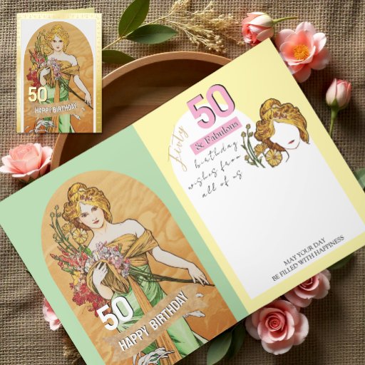 Alphonseミュシャが動機とする春アートワークを搭載した素晴らしい50thバースデーパーティー紙プレート。ヴィンテージ春女神の美運しい花を腕に黄金の太陽の髪でスタイリング。あなたのパーティーのための光沢のある黄金の紙プレート。年齢や文字は簡単に調整できる。