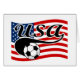 米国のサッカーのワールドカップ2010年、白黒サッカーボールおよびトレンディーのあと波の古い栄光の星条旗の旗は設計します。