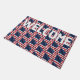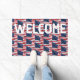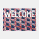 そよ風になびくアメリカ国旗の写真。このフォーマットでは、フラグ画像はタイル状の印刷デザインに配置される。白いフォントではっきりしたは、歓迎の言葉である。Image Copyright ©Kimberly J Tilley. zazzle.com/store/developingnature
