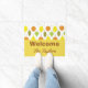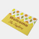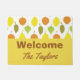 この秋の葉の模様のウェルカムマットで玄関口をパーソナライズ。白い背景に緑、黄色、茶色の葉の模様を見せるマット。下半分は茶色のプリントでサンプル文字「Welcome The Taylers」を表示するタンの背景を持つ今日あなたの家にこれを追加!アートワークの作成者: AMBilluses http://www.etsy.com/shop/AMBillustrations/