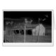 テキサス州牧場のシカの(雄ジカの)枝角そして納屋の白黒赤外線写真。