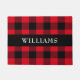 この樵のスタイルの赤くおよび黒い水牛の点検パターン玄関マットは白い文字で姓の中心を渡る黒いストリップを備えています。 あなた自身の名前とまたはギフトとして与えるために個人化して下さい。