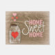 素朴な木が付いている家の甘い家のメーソンジャーそしてハートのドアマットは背景を織りました。