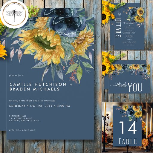 こ祝のひまわりの詳細エンクロージャカードで素晴らし結婚、愛の暖かさと活気。夕花鮮やかの黄色と茶色の色合いは、ほこりっぽい青いケシや緑豊かな緑の葉に補完され、魅惑的で楽しい雰囲気を作り出す。ダークブルーの背景は洗練されたtouchを加え、クリーンな白いフォントは確モダン認しエレガントて見える。このデザインは、幸福とお祝いの結婚本質を捉える夏の選択に最適である。このデザインで描お客様の特別な日の暖かさと美しいを楽しませてく素晴らしださい。Simple Farmhouse Pressによって作成。