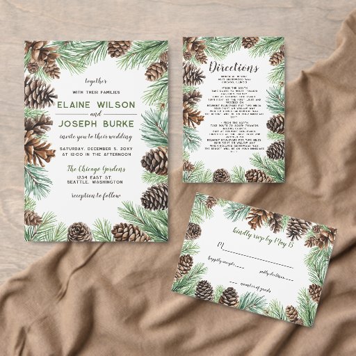 冬の素朴葉パインコーンの結婚Vellum招待状は、招待状の下で一致するデザインまたは写真とペア