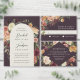 ブルゴーニュ、マルサラ、赤面ピンクとアイボリーの豊かな秋の色合いのバラやミムのリースで囲まれた名前を特徴エレガントとし、フローラの招待の封筒を封じたり、好みに合わせて使用したりし葉て、濃い緑の結婚式用シールや葉とす。秋や冬のウェディングに素朴備え結婚た開花フローラのコレクションに合わせて設計。
