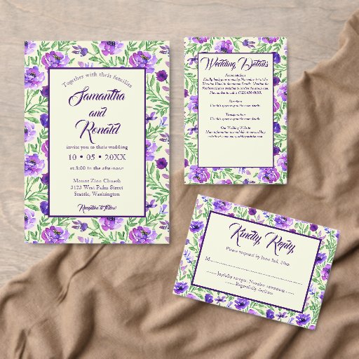紫色と緑色の水色の花を使用したウェディングプログラム。