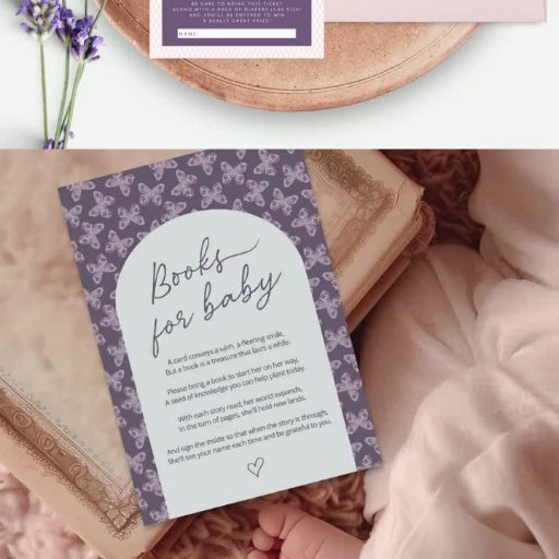 「感謝していは来、紫のピンクのフローラ蝶の赤ちゃんシャワーラベルのために。「感謝していfor!」はデザイン要素として含まれ、残りの文字はフォントや色を含むカスタマイズ可能である。ラベルの背面は相補的なピンク格子パターンを有する。© Kimbeluated, LLC