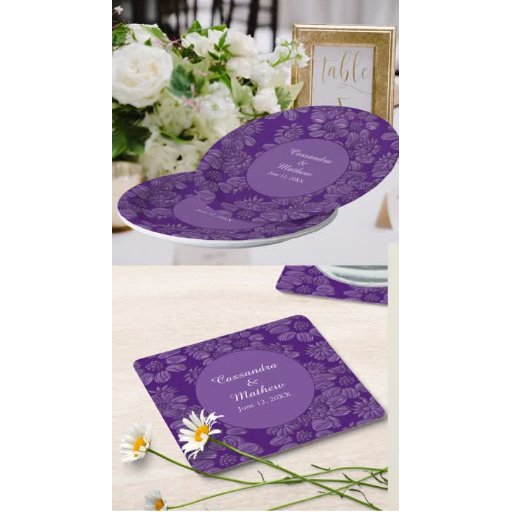 パープル結婚のトランプのポーカーチップエレガントは、3Dのような外観と半透明の背景を持つデイジーを特徴とあなたの好みの色を示す。中央の部分無地のは、カップルの名前と日付が表結婚示された円を表示する。背中にはデザインのみ。編カスタマイズ集した背景の色。