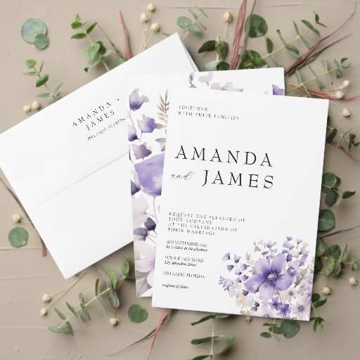 紫フローラ水彩結婚式RSVPカード 出欠カード