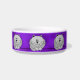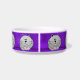 このかわいくカスタムな陶磁器の名前入りなペットボールはお洒落な灰色の脂肪質の漫画猫を紫色の背景で押し込められる足および包まれたな尾によって、置かれることを備えています。 皿のまわりにそれらがあります。