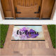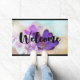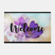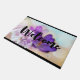 ガラスの瓶の中に黒い紫のクロッカスの素敵な写真がセットされたウェルカムドormat。背景には淡い紫色の花が咲いている。