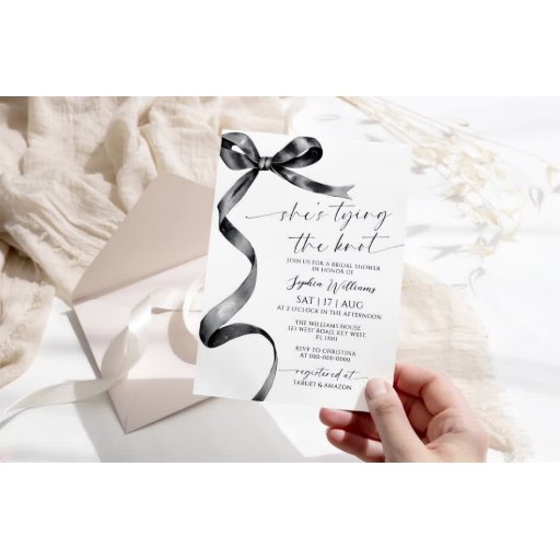 彼女は結んでいる結び目ブラックボウのブライダルシャワーの招待状 – 黒いボウのデザインを特徴エレガントとするこのブライダルシャワーの招モダン待に喜び。新婦祝に最適な、この招待はあなたの特別なイベントに洗練と魅力のtouchを追加。***お店の検索でH135を入力して一致するすべての項目を検索***または当社のブラックボウコレクションを参照してください。***この高品質デザインはカスタマイズお客様の色とスタイルとテーマに合わせ結婚る簡単である。さらにカスタマイズする場合はクリック、「デザインツールを使用して編集」リンクをクリックし、デザインツールを使用してこのテンプレートを変更する。要もし件救済又は一致する品連絡目を下さい