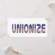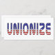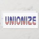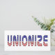 団結しろ!愛国心だ!ウィスコンシン州、オハイオ州、インディアナ州の労働者のように全国の労働者を支援し、赤、白、青の「ユニオナイズ」という言葉を使った愛国的なデザインを取り上げる。組合は愛国心がある。組合はアメリカを強化する。