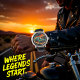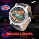 この大胆な時計の文字盤には、ヴィンテージスタイルの緑色のホットロッドカーが特徴で、その下半分は強烈なオレンジ色と赤い炎に囲まれ、暗い道を駆けているように見える。背景には、暗くて嵐のような雲が、燃えさかるような色合いと溶け合って、自動車愛好者にとって劇的で力強いシーンを作り出している。