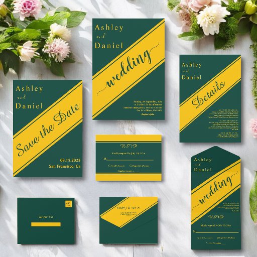 このエレガント緑と金ゴールドの結婚式招待状はモダンのに最適でシンプルす結婚が、金ゴールドの書エレガント跡を緑の背景に備えている。