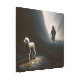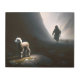 柔らかい光が岩場に立つ失った子羊の表情を浮き彫りにし、杖を持つ羊飼い後を追の後ろを映し出す
