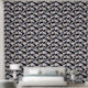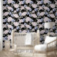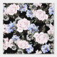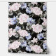この飾商品は、黒い背景にバラ、アイリス、緑の美しい花のパターンである – 色:ピンク、ブルー、グリーン、ブラック、ホワイト