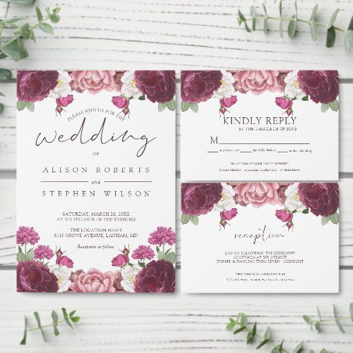 美しいフローラブルゴーニュ結婚ーズ 招待状