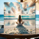 美しい雲が空に浮かめい想んでいる美しいビーチの上に、海のガラスに囲まれた青い海の波に女性の愛アートのイラストレーション澄ん。