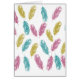 白い背景にティール(緑がかった色)、マゼンタ、金色の黄色の羽のパターン。