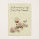 ピンクの花、チャリス、ホストと美しい最初の聖餐式レースの記念カードをパーソナライズ。
