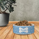 このボウルは、ペットの名前を骨の部分にパーソナライズできる、かわいいブルーのギンガム柄のペットボウルです。