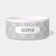 最もかわいい毛むくじゃらの相棒のために、グレーの色合いで名前ラベル付きの素敵な肉球プリントハートパターン ペット犬または猫のボウル。サイズを選んで、テキストを簡単にパーソナライズ。 - ケイト・エデン・アート
