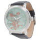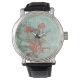 背景に赤い花のシルエットティール(緑がかった色) 腕時計