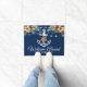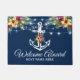 紺パーソナライズされた色の背景を使った船のドアマットで、色、帆のいかり、水航海の色の熱帯夏の花、水色の照明、ストリングライト、エレガント文字の「ウェルカムボート」、船名などに変更できます。