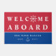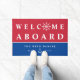 白で書かれるの歓迎を用いる赤いそして青のあなたのボートのための航海のなドア・マット。 歓迎のoは船の車輪によって取り替えられます。 ボートの名前のボートのドアマットを個人化して下さい。