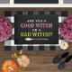 この面白いハロウィーンのdoormatは、引用文"あなたは良い魔女か悪い魔女か?"タイポグラフィデザイン白、ピンク、および黄色の緑の色と魔女のブロムスティックのアクセントを備えている。