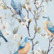 青い壁紙に花が咲いたオレンジ淡い色のと青の鳥