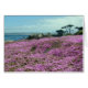 ピンクの花の分野は太平洋果樹園、カリフォルニアの水晶青い海の方に滝のように落ちます。